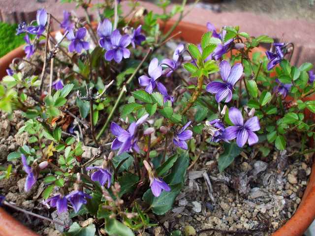 ミニバラは、世話が足らなくて貧弱になってるけど、雑草的立場のスミレは、何もしなくても元気に咲いている。
