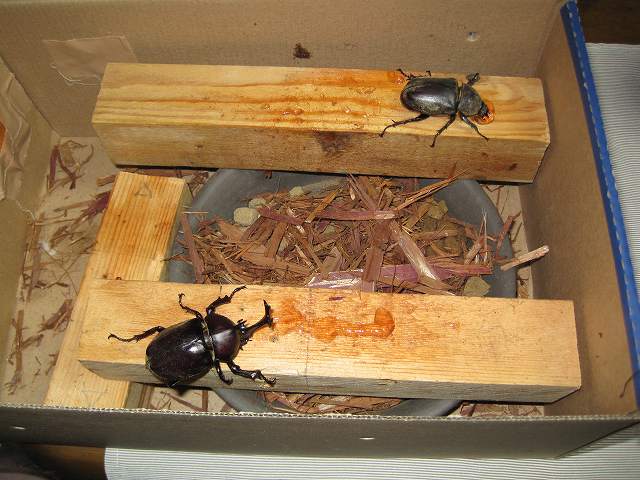 そのうちに家の明かりにやって来て、窓にぶつかったメスのカブトムシも仲間入りしました。